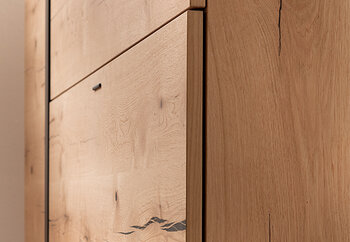 Selbstverständlich achten wir bei jedem einzelnen Möbelstück darauf, die Ausstrahlung und Maserung des Holzes optimal zum Ausdruck zu bringen und den jeweiligen Charakter zu unterstreichen. Wuchsmerkmale wie Jahresringe, Ästchen, Einwachsungen und unterschiedliche Farbnuancen sind daher nicht nur unvermeidlich, sondern geradezu naturgegeben. Besonders wichtig ist es aber, direkte Sonneneinstrahlung, starken Tageslichteinfall oder direkte Halogenbestrahlung zu vermeiden, da Naturhölzer sonst ausbleichen können.